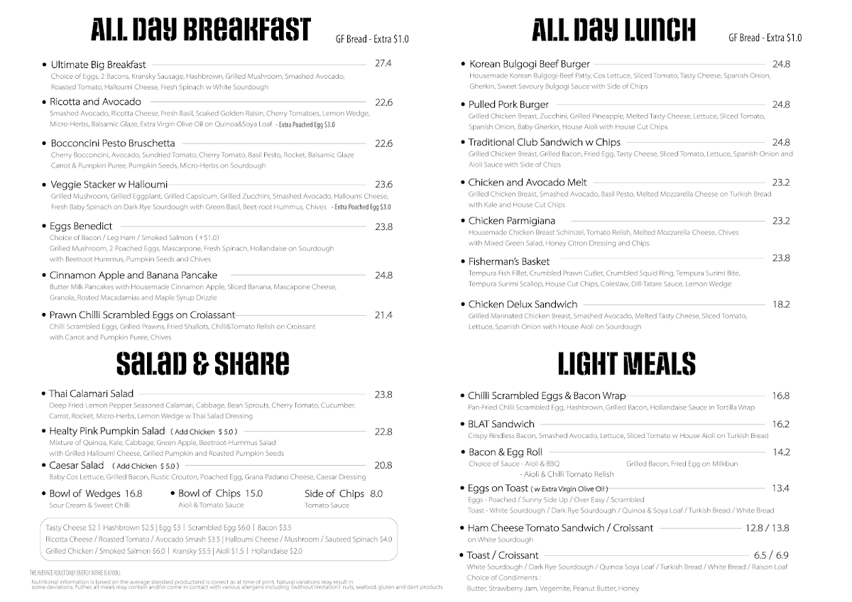 Food selections are organized into breakfast dishes, sandwiches, salads, and main meals. Breakfast options include items such as Toast, Croissant, Eggs on Toast, Smashed Avocado, Eggs Benedict, and the Big Breakfast. Sandwiches and light meals include Club Sandwich with Chips, Chicken Burger, Beef Burger, Bacon and Egg on Turkish, Chicken Avo Melts, and Fish and Chips.
